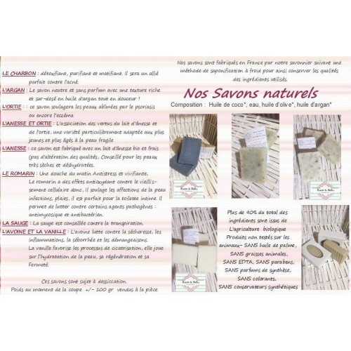 Nos savons sont fabriqués en France par notre savonnier par une méthode de saponification à froid pour ainsi conserver la qualité des ingrédients utilisés.